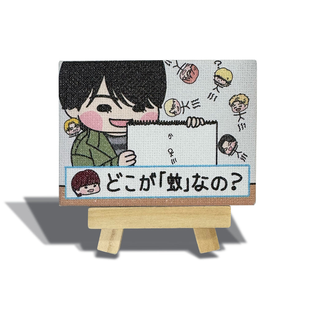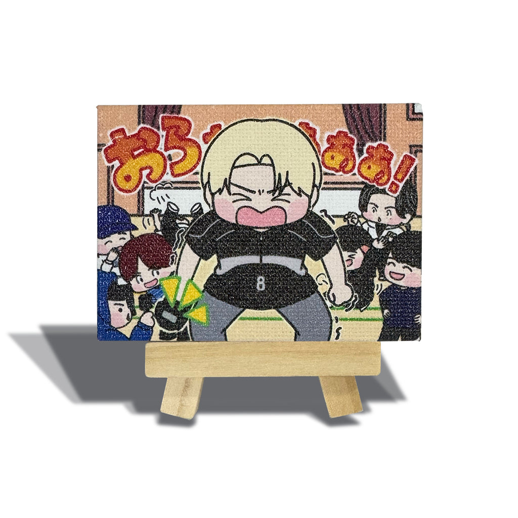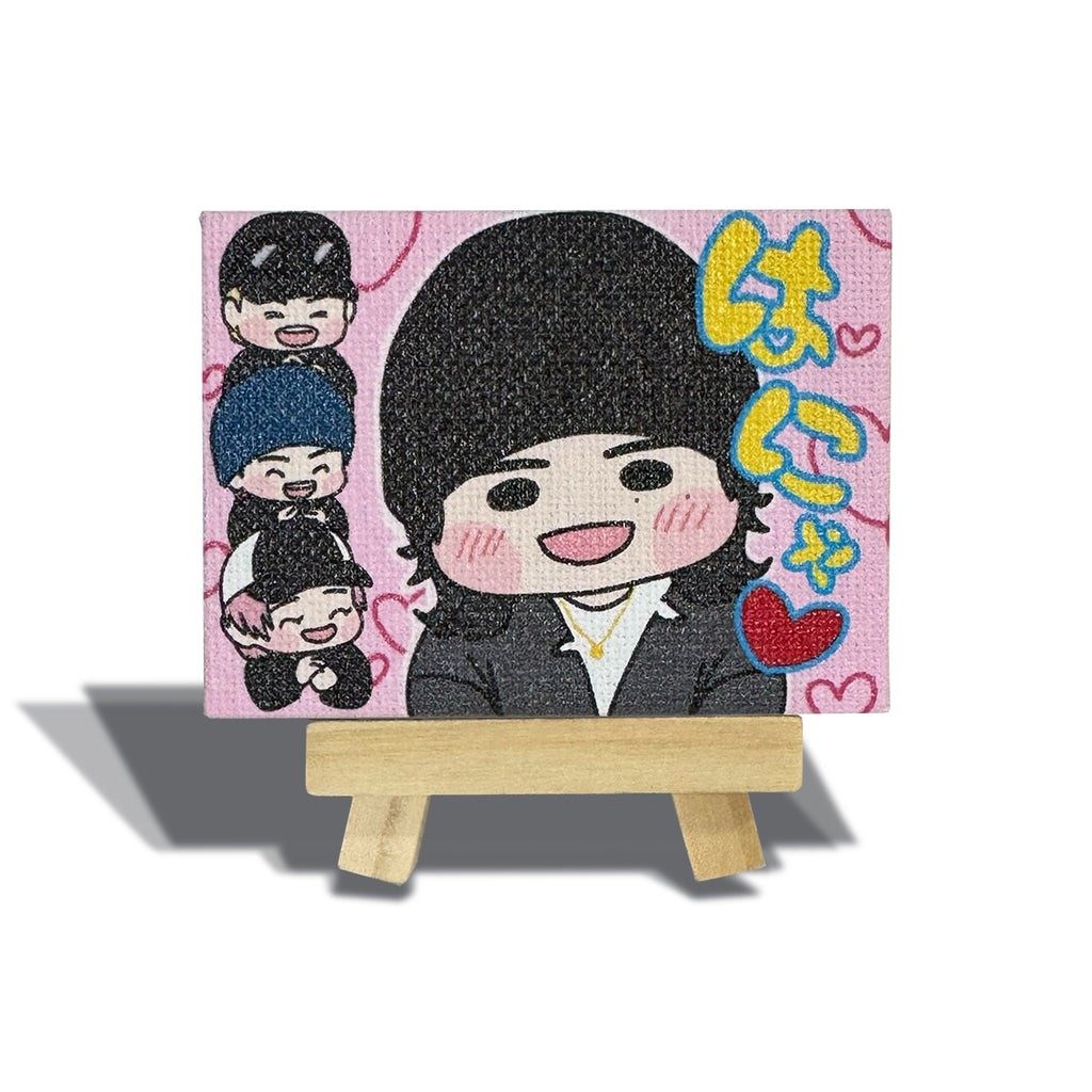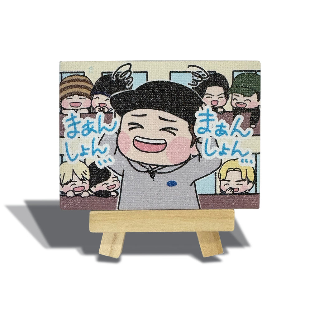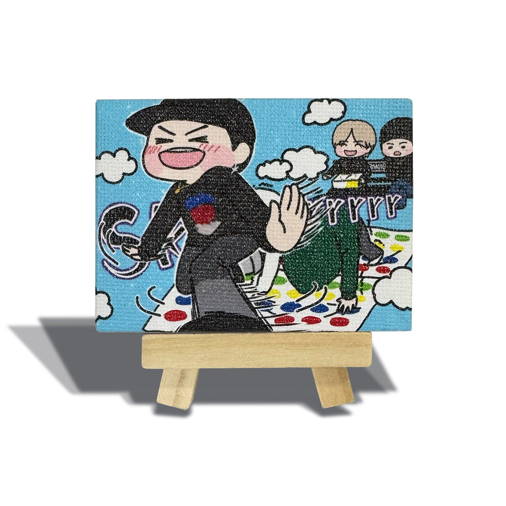 Papan seni kanvas mini yang dibuat oleh seniman Mazebe untuk barang kolaborasi ini setelah mendengar dari para anggota tentang Mazebe dan adegan terkenal mereka.